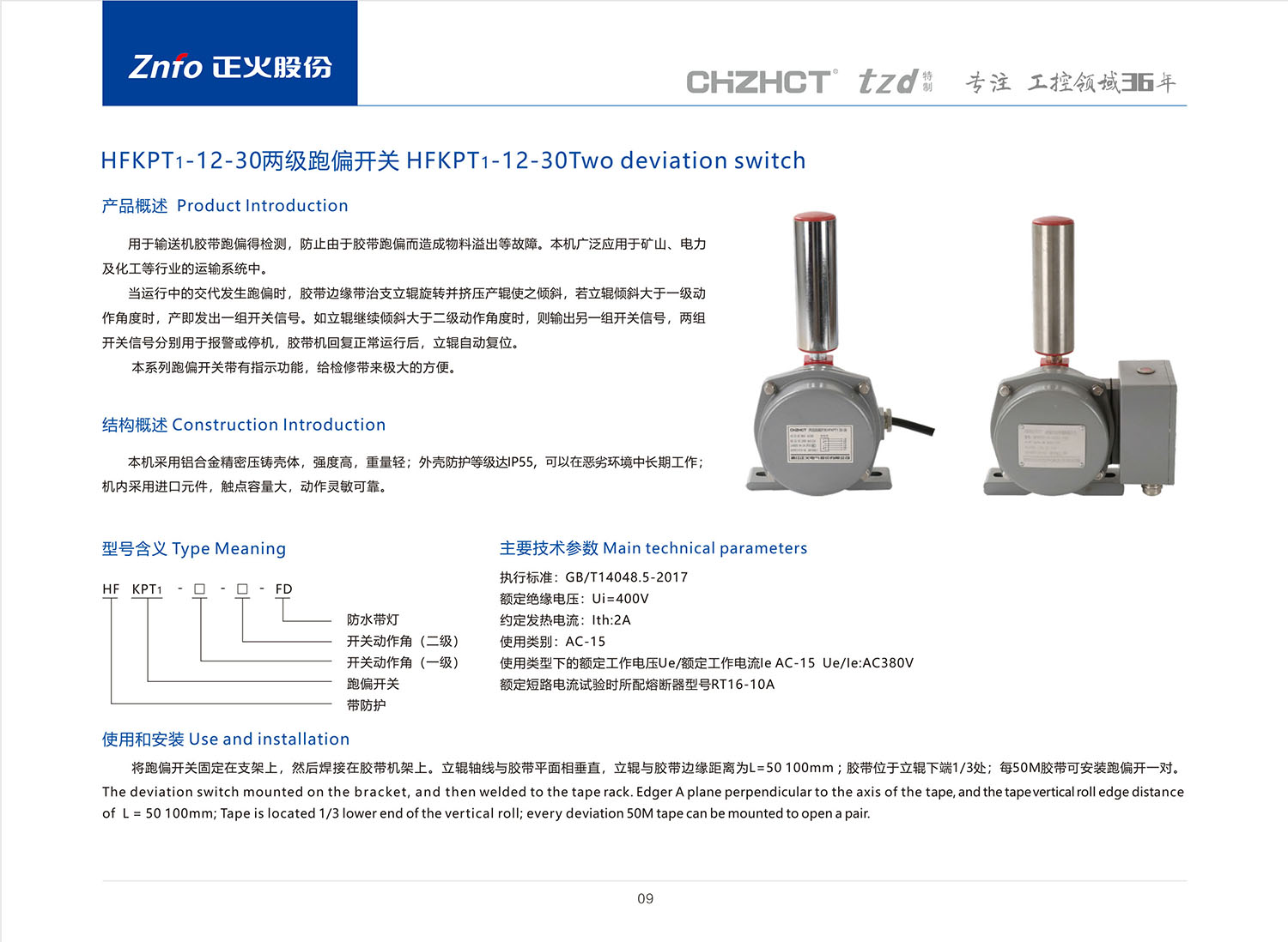 HFKPT1-12-30两级跑偏开关 _跑偏开关_行程/微动/跑偏/拉绳/超速_工业控制与保护_产品中心_ky开元电气股份有限公司